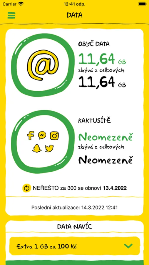 V přehledu služeb vidíš aktuální stav svého kreditu, čerpání jednotek z předplaceného tarifu NEŘEŠTO nebo z balíčků (Minut, SMS a Dat). Uvidíš přesně, kolik ti jednotek ještě zbývá, kdy si ti předplacený tarif obnoví, kdy si dobít kredit nebo aktivovat nový balíček.