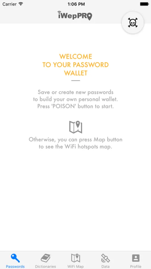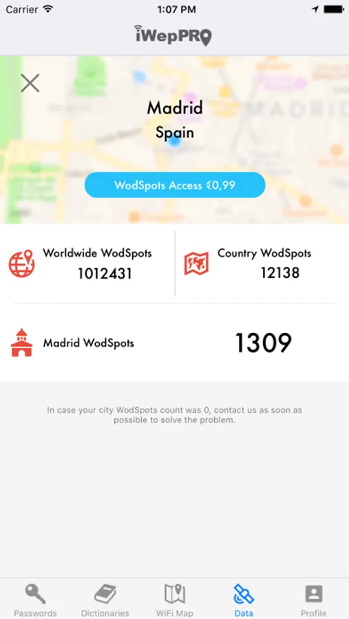 WiFi map at first run is empty, you have to visit 'Data' tab and unlock WodSpots or download the free WiFi hotspots database for your location. You will see a world map where you can select your country and download #iWepPRO Lite database.