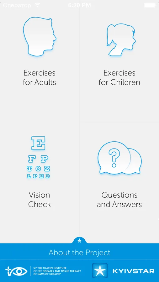 In the Kyivstar mobile app «Healthy Vision» you will find special exercises to relieve stress and train your eye’s muscles, as well as the eye test. This app is based on the techniques of the Ophthalmology Institute of Eye Disease and Tissue Therapy of National Academy of Medical Science of Ukraine named after P.V. Filatov.
