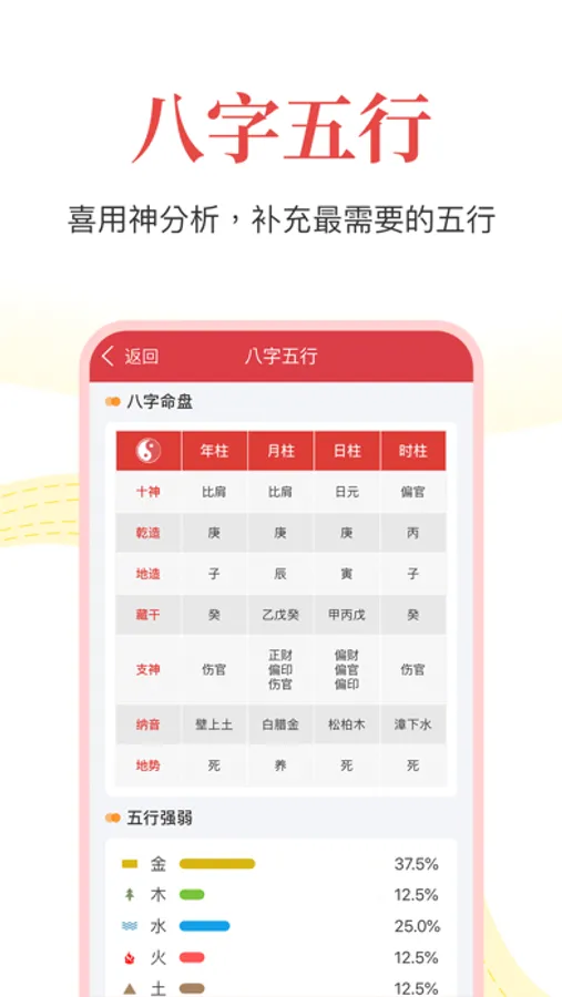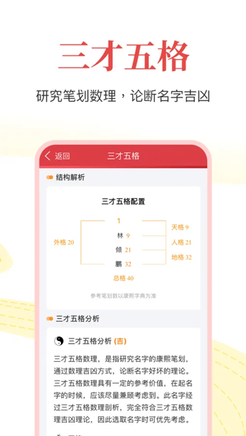 • 灵占起名中也包含解名功能,同样也是结合您的八字信息、三才五格、五行喜用神等传统姓名学的知识来为您的名字打分。