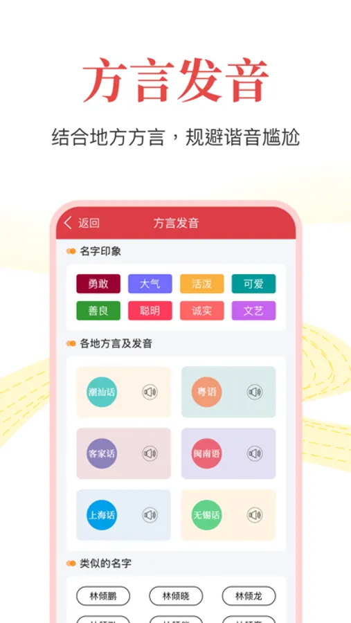 • 起名通过层层信息筛选,依托独家姓名数据库,包含普通好名,高端好名及顶级好名等搜索模式,可进行单名和双名搜索。