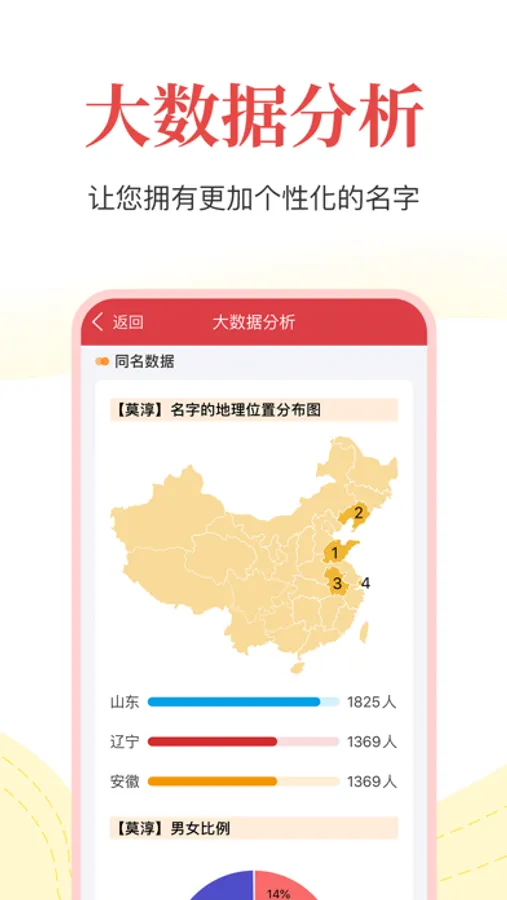 • 全国同名统计,依托大数据分析,独家统计男女、学霸、生肖、星座、行业等比例。