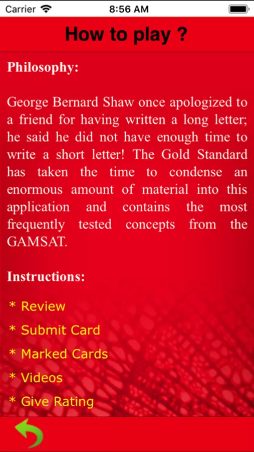 Gold Standard GAMSAT (Graduate Medical School Admissions Test) Biology Flashcards application contains the most tested GAMSAT Biology topics and concepts summarized using 113 high quality probing questions that are divided into 3 categories: Knowledge, Conceptual and GAMSAT 100 (i.e. the most challenging category). Colourful illustrations for better understanding, clear explanations and easy navigation. Scores are saved to keep track of your progress and there is an option to mark difficult questions for later review. This Gold Standard Flashcards App is a learning tool for revision but it is not a multiple-choice practice exam.