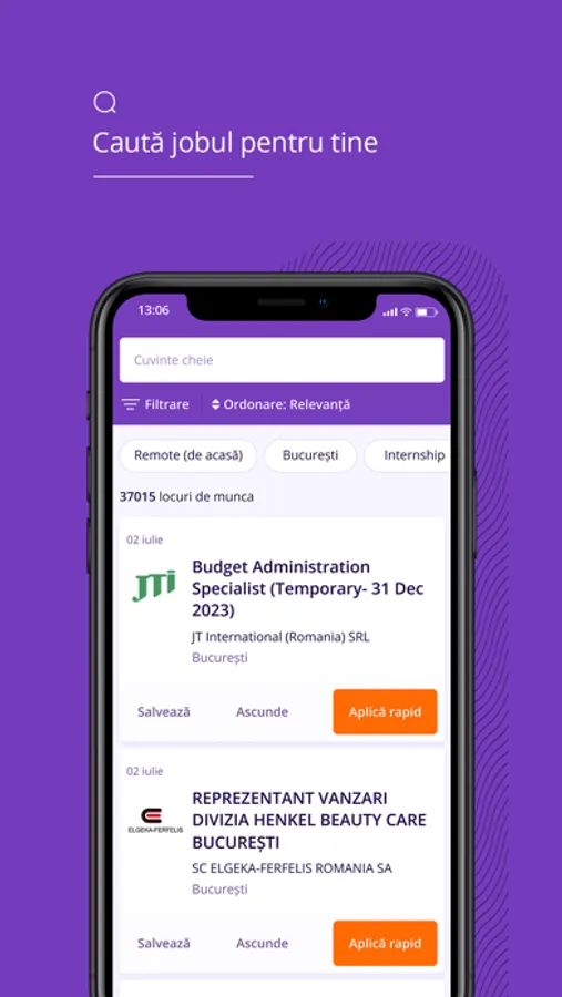Mai mult, pe eJobs vei găsi anunțuri cu locuri de munca în străinătate sau cu optiunea de muncă de acasă (remote work / work from home). Asadar, dacă erai în căutarea unui job ideal pentru spiritul tau liber, sigur îl vei gasi cu ajutorul acestei aplicații de angajări, care-ți pune la dispoziție posturi și locuri de muncă diverse. Jobul care se mulează perfect pe nevoile tale te așteaptă la câteva click-uri distantă, așa că nu-ți fie teamă de procesul de angajare! Descoperă ce cariere ți se potrivesc!