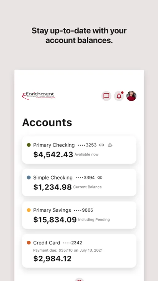 Enrichment's Mobile Banking App makes it easy and secure to manage your finances from anywhere, anytime. You can set text alerts on your account for account activity and view all of your Enrichment accounts in one place.