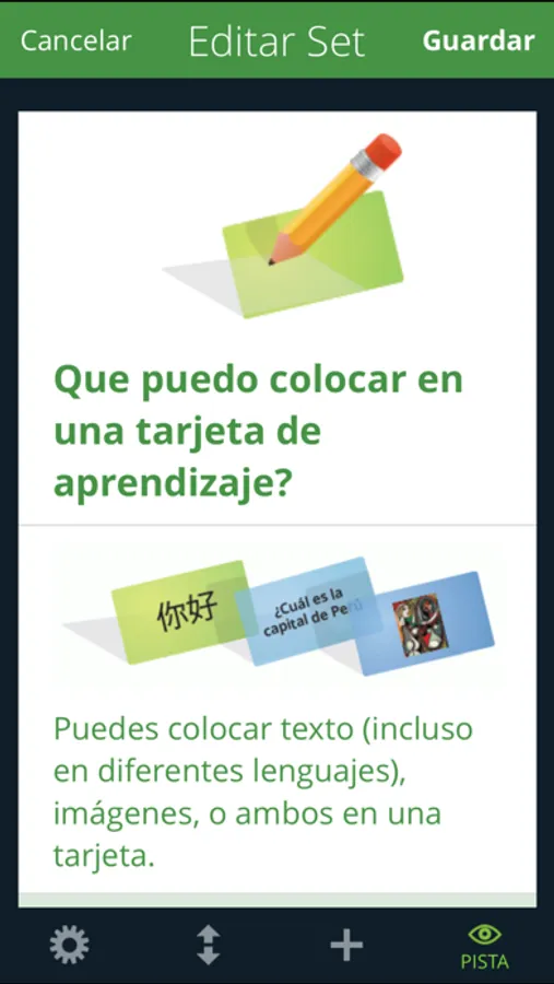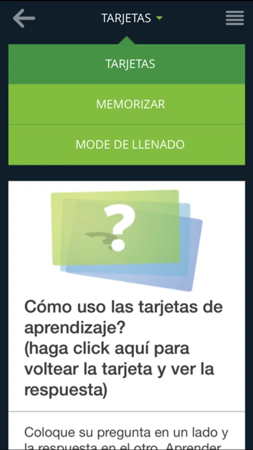 El modo tarjeta te permite ver rápidamente un grupo completo de tarjetas y repetirlas tanto como desees. El modo Memorizar oculta automáticamente las tarjetas que conoces para que te puedas concentrar en las que aún necesitas aprender. Puedes incluso habilitar la opción llenado para supercargar tu estudio con repeticiones espaciadas similares al sistema Leitner!