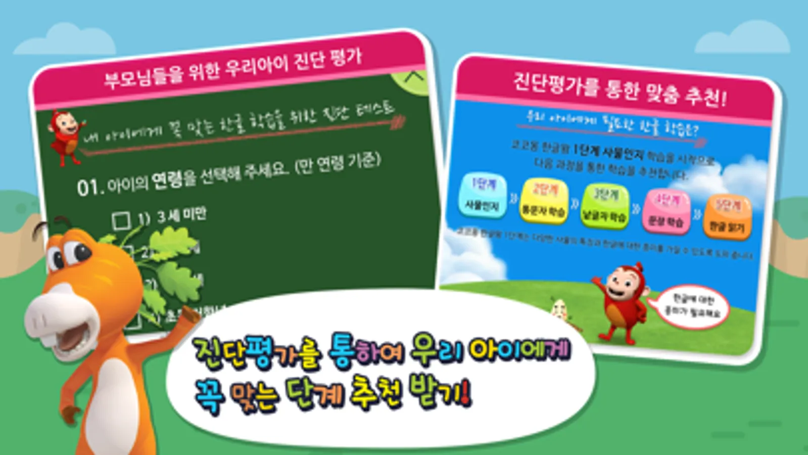 1. [아이용 진단평가] 아이 스스로 문제를 풀어보고, 수준에 맞는 한글을 선택하는 맞춤학습