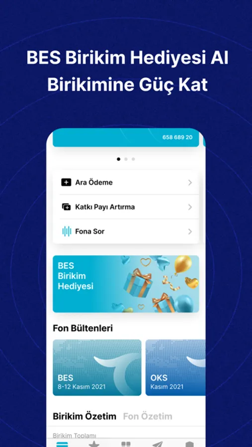 -BES sözleşmenizdeki birikimlerinizle ilgili fon değişikliklerinizi, geçmiş/gelecek vade ve ara ödeme işlemlerinizi, hesap hareketlerinizin takibini yapabiilir ve ayrıca Türkiye Hayat Emeklilik sözleşmesi olan herkesin birikimine destek için BES hediyesi gönderebilirsiniz.