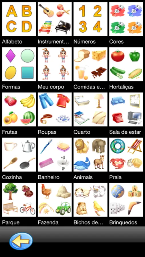 ● 24 categories: Alphabet, Colors, Shapes, Numbers, Body, Clothes, Animals, Farm, House, Park, Beach, Food, etc...