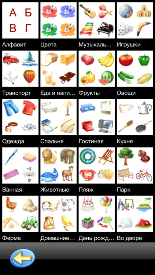 ● 24 categories: Alphabet, Colors, Shapes, Numbers, Body, Clothes, Animals, Farm, House, Park, Beach, Food, etc...