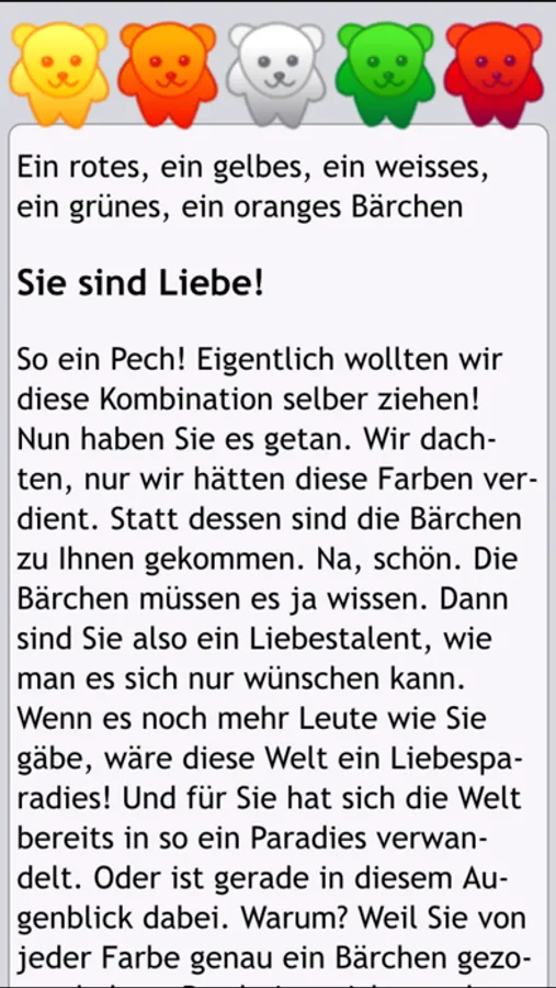 ● Stupsen Sie die fünf Bärchen an, die zu Ihnen sprechen sollen. Die Bärchen bekennen Farbe und zeigen so an, wie es um Sie, Ihre Zukunft und Ihre Liebe steht.