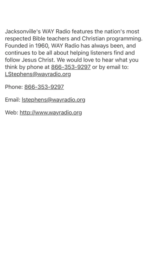 If you're looking for relevant Bible teaching and quality Christian programs from speakers like David Jeremiah, James Dobson, Charles Stanley, and Ravi Zacharias then look no further. WAY Radio originates in Jacksonville, Florida on AM 550, FM 103.3, and FM 104.9.
