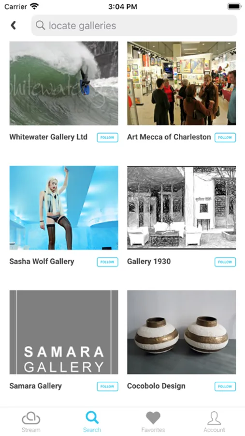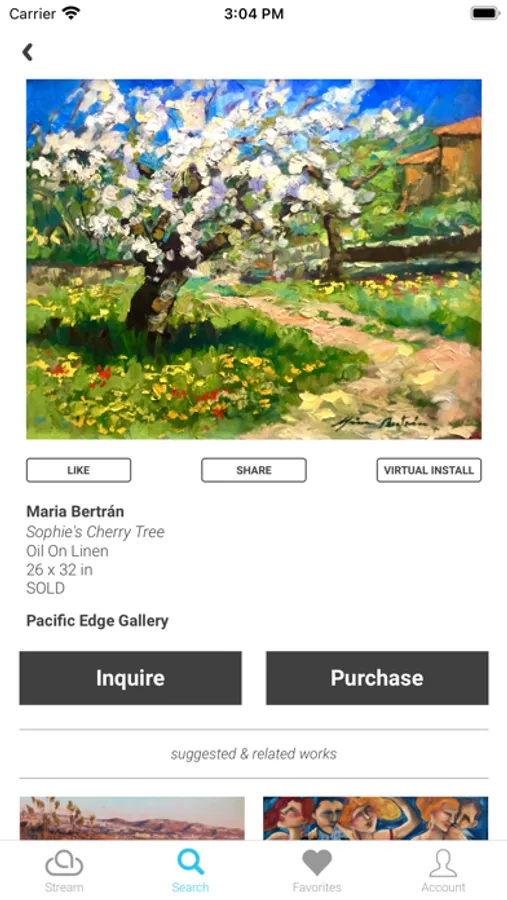 access ArtCloud’s marketplace which hosts thousands of global galleries. Browse their collections and follow your favorite galleries to stay up-to-date on their latest inventory. Localize your search and connect with galleries in your current location to inquire on a piece, or schedule an appointment.