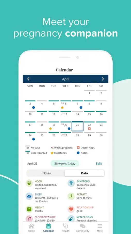 ◆ Calendar to organize and track all things pregnancy, from baby bump photos to doctor appointment reminders