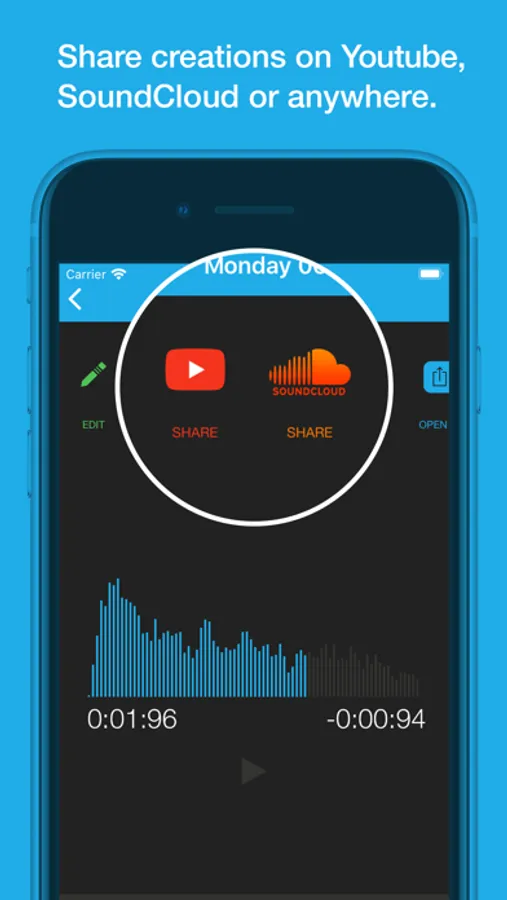 Share your songs and audio creations directly to SoundCloud, Youtube, and open it anywhere with built-in iOS sharing or the Files app.