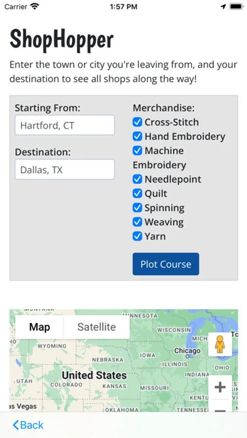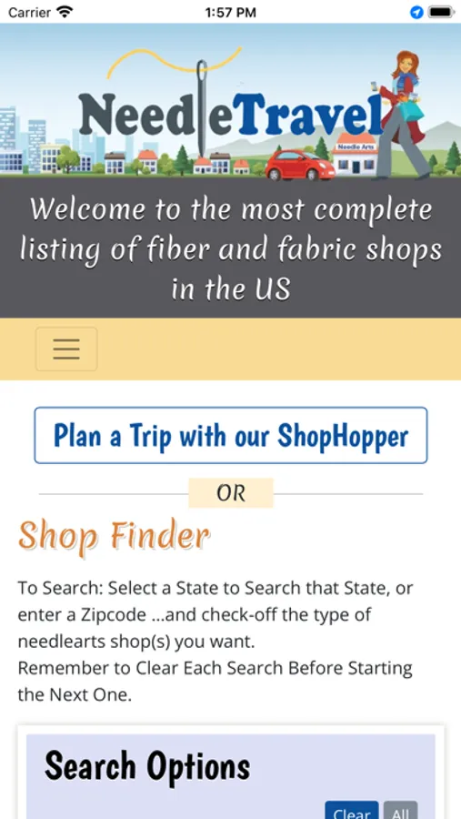 It’s never been easier for Needleartists to find and visit their favorite shops: quilt, yarn, needlepoint, weaving, spinning, cross-stitch and/or embroidery. Just click on a shop near you and get driving directions. Or change the settings to limit the search (e.g., quilt only, or yarn and needlepoint only). You can even change the search area to see shops not just near you now, but shops near places where you intend to travel.