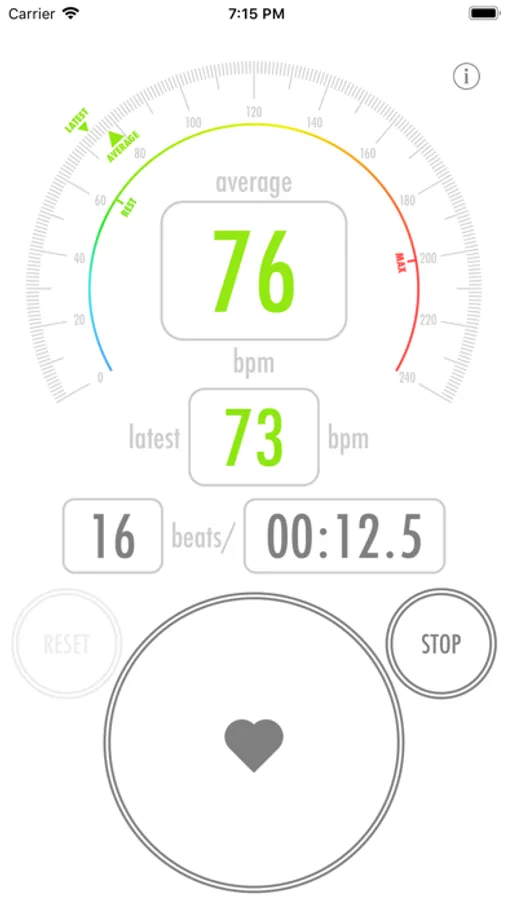 After tapping "start button", the average heart rate will be displayed in the uppermost frame by tapping "heart button" at every one beat.