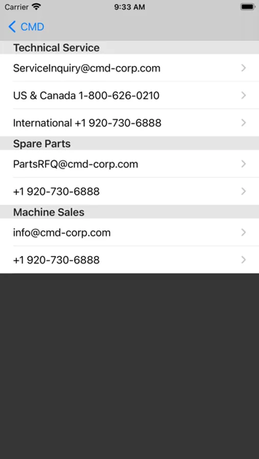 Easy access to contact information for CMD service and sales (machines and parts) is also part of this App. More information can be found at www.cmd-corp.com
