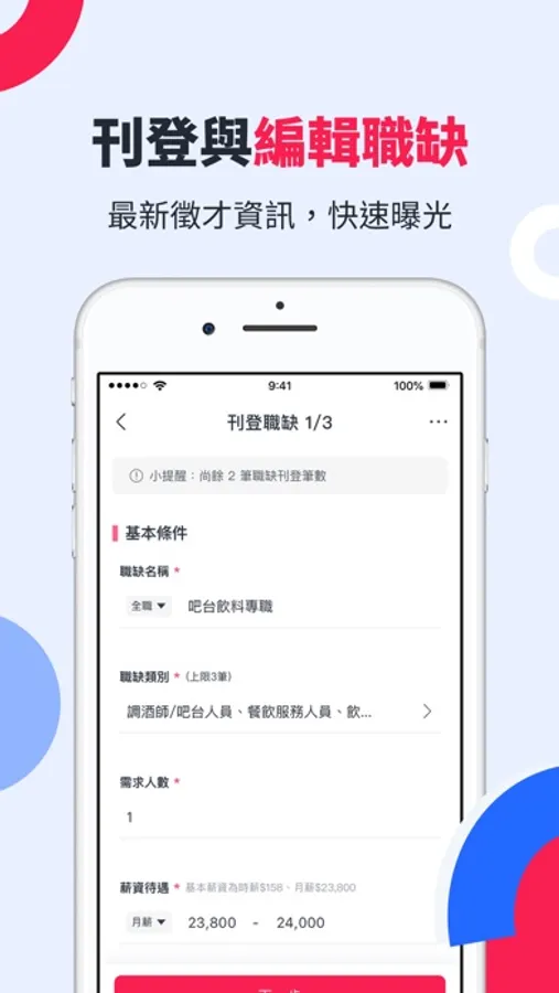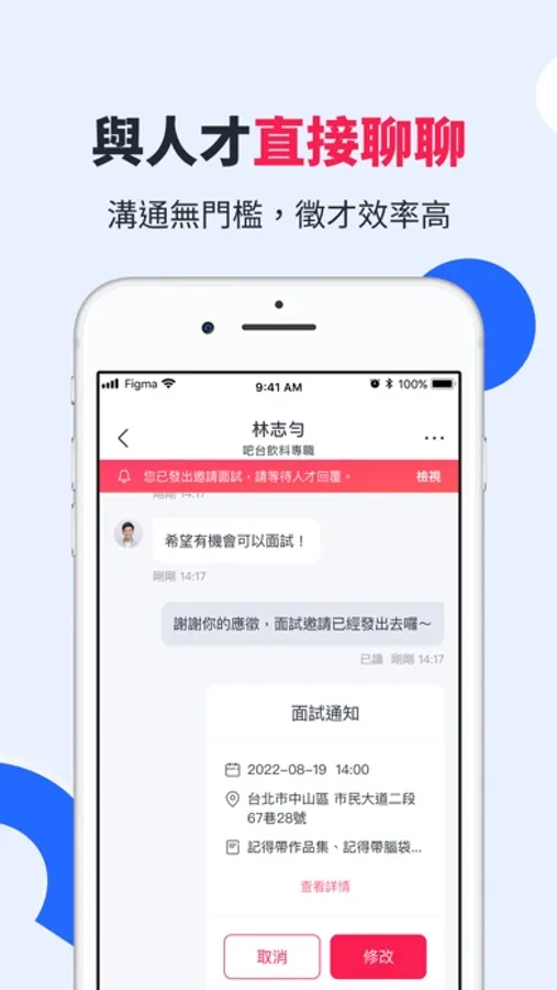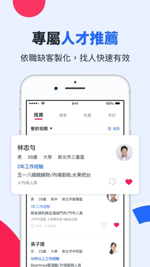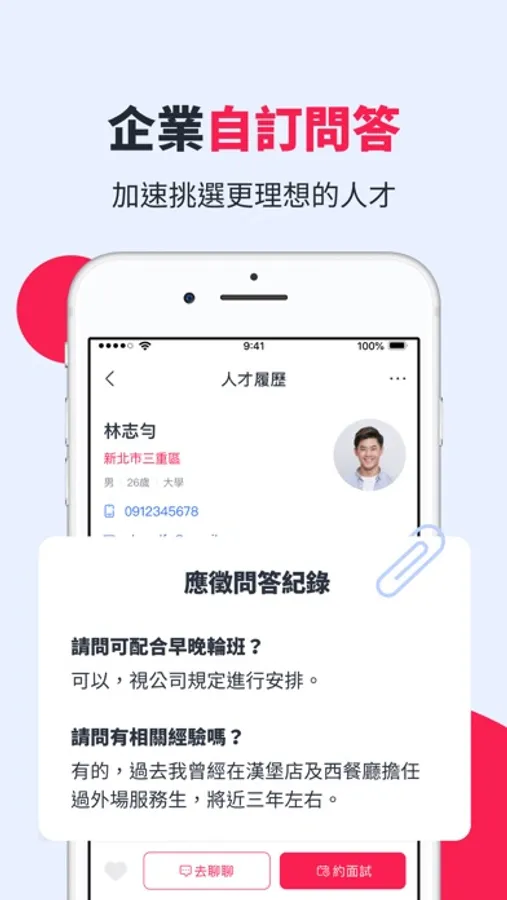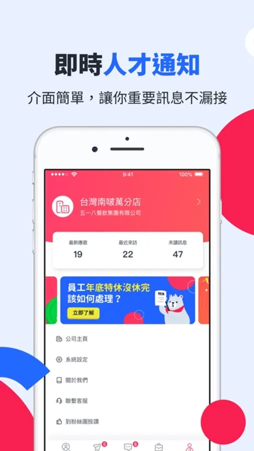 我們以簡單為核心精神,讓你不用待在電腦前徵才,手機也能輕鬆找人才!即時接收最新應徵通知,提升企業招募的效率,找人才快又有效!