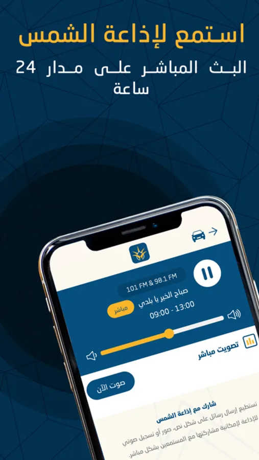 يتيح لك التطبيق التواصل المباشر معنا من خلال التصويت المباشر على الأغاني التي ستبث او اقتراح قائمة اغنيات نضمها رسميًا لزاوية الموسيقى داخل تطبيق الشمس.