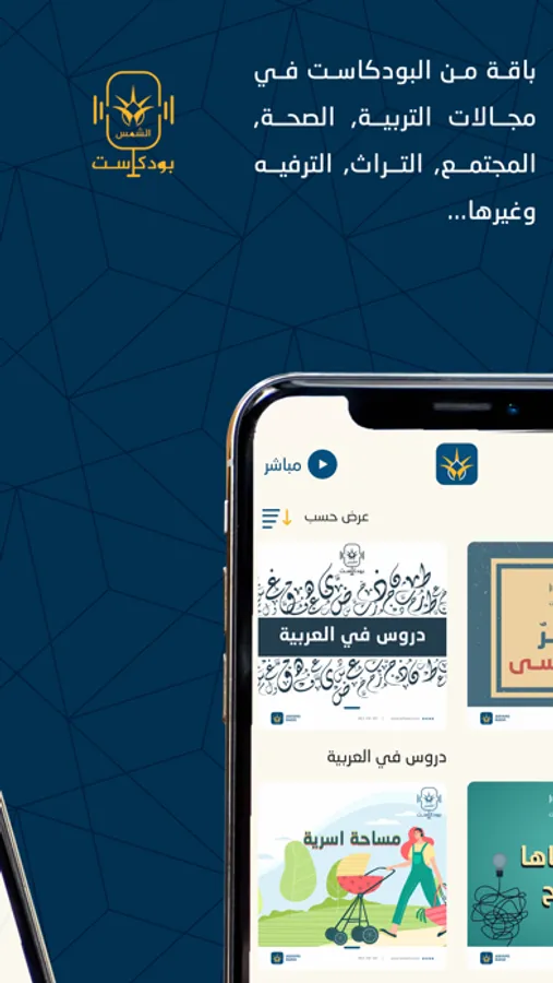 في تطبيق الشمس يمكنك الاستماع للبث المباشر على مدار الساعة بالإضافة لباقة من الپودكاست في مجالات التربية، الصحة، المجتمع، العلوم، التراث والترفيه, وغيرها..