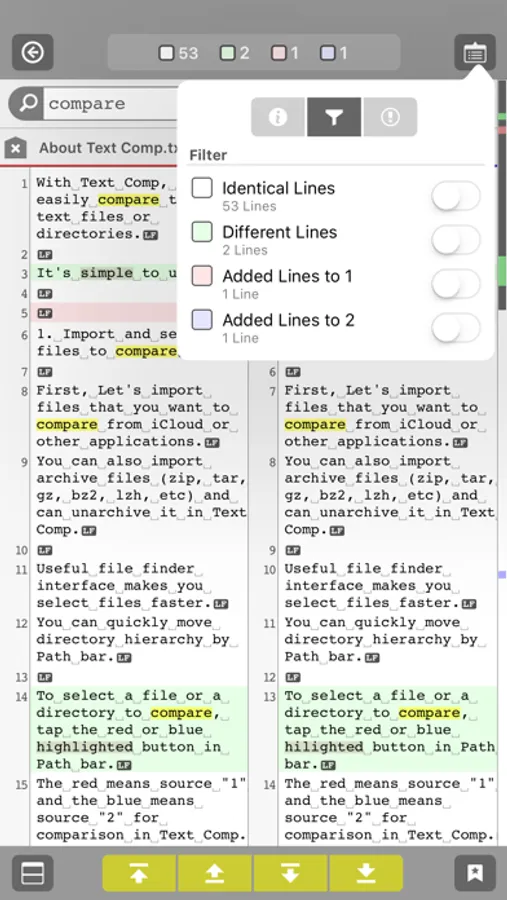 Also, theare are useful features like search and line marker (Text Comparison only) that will help your analysis of the results.