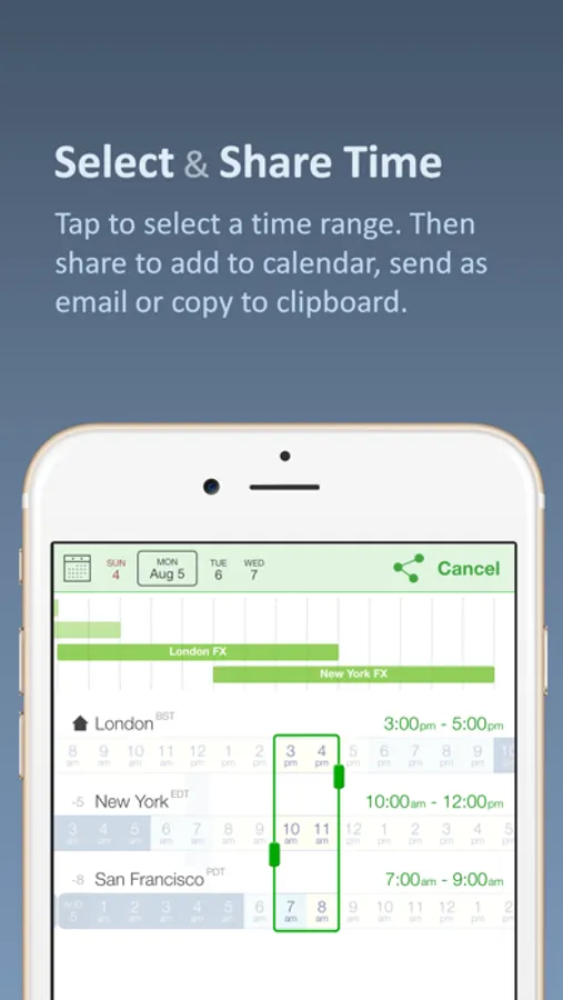 ▶ Select and share times by adding to your calendar, sending in email or copying the times to clipboard.