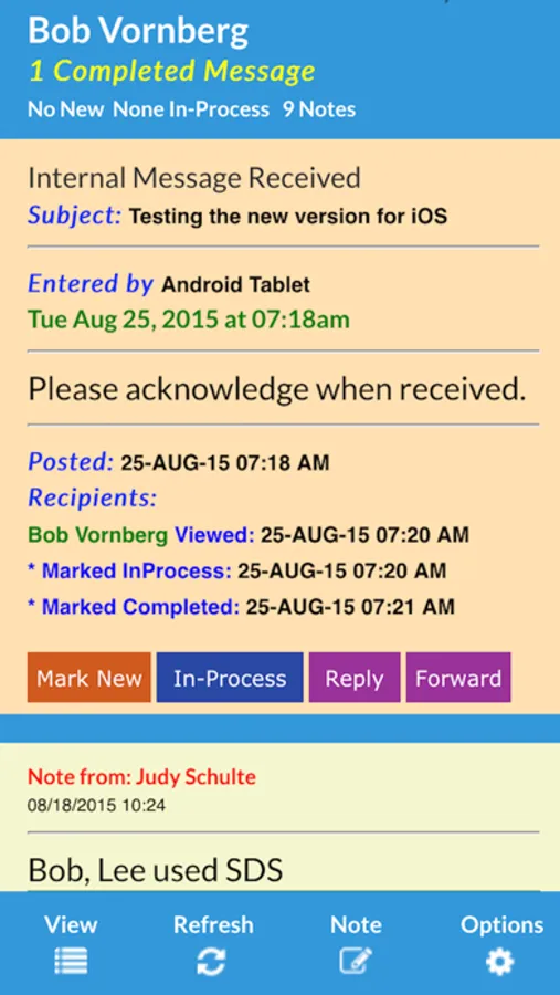 Spectrum Secure Delivery secures PHI by protecting access with a configurable passcode, encrypting the transmission of data and not storing data on the phone or tablet. When a messages is received the user can Reply, Forward, mark In-Process, or Completed. The inbox can be filtered to display all messages, new, new or in process, complete and notes with the message filter. The message history is displayed below the message for all message recipients.