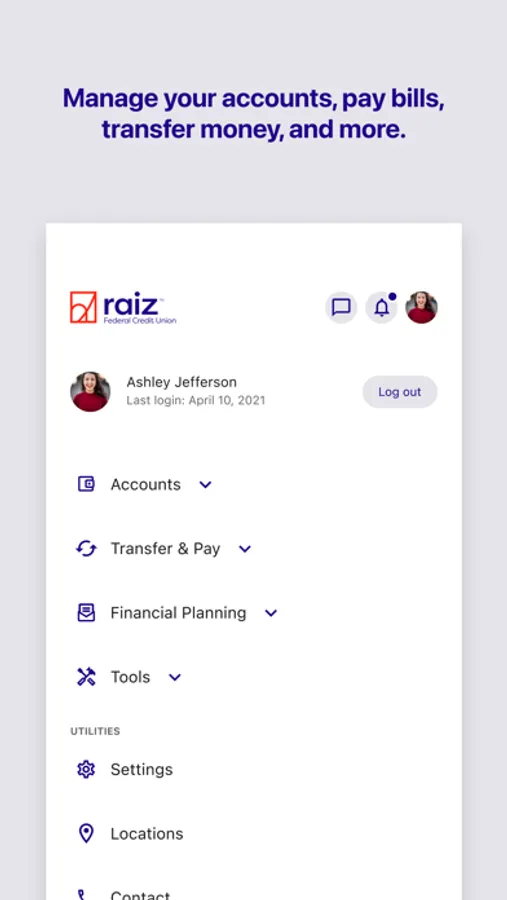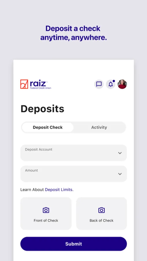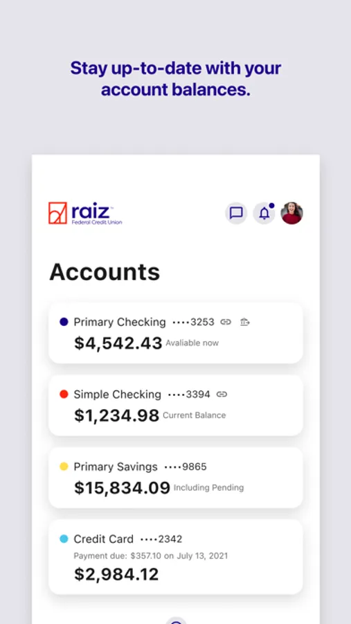 Our modern design and features allow intuitive navigation and account management. The Raiz mobile app is your all-in-one place for banking on the go. With our app, you can open new accounts, apply for loans, receive statements, view your credit score, manage your cards, and much more.