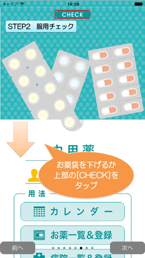 服用チェック画面に表示されているお薬の一覧から飲んだお薬をタップするだけで、服用の登録ができます。