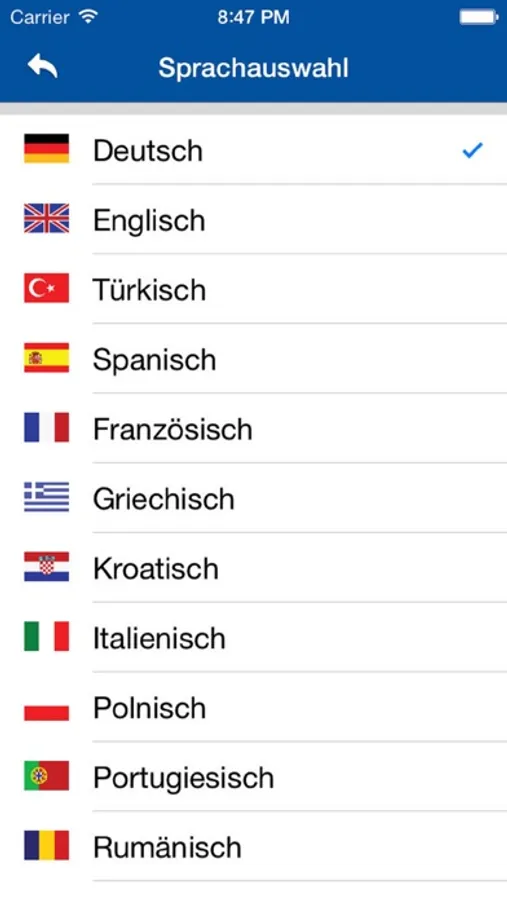 • Sprache in Deutsch, Englisch, Türkisch, Spanisch, Französisch, Griechisch, Kroatisch, Italienisch, Polnisch, Portugiesisch, Rumänisch, Russisch und Arabisch.