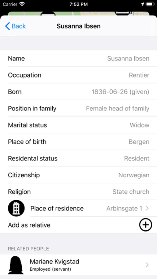 People or locations of relevance may be added under "Relatives" for easy access later. Findings placed under "Relatives" may be exported via mail using the gedcom 5.5 format.