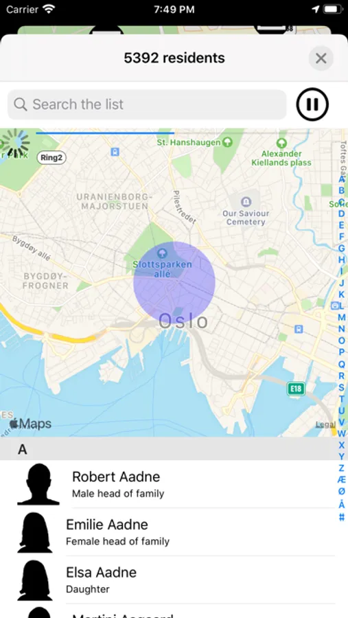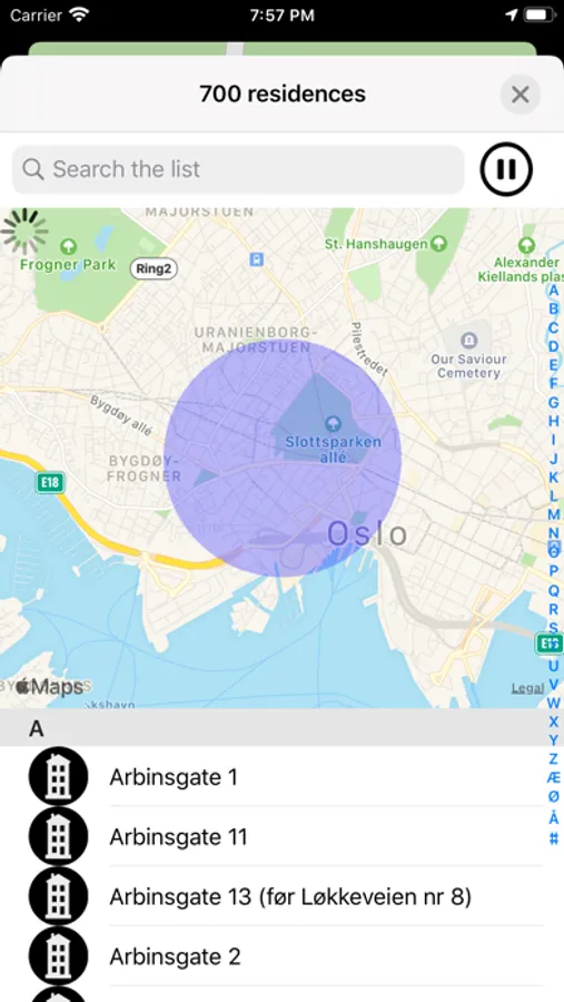 In addition to manually searching the map for residences, it is possible to perform geographical searches in ever-increasing radius starting at the current map position. The search may be paused to inspect partial results, and filtered using a text field.