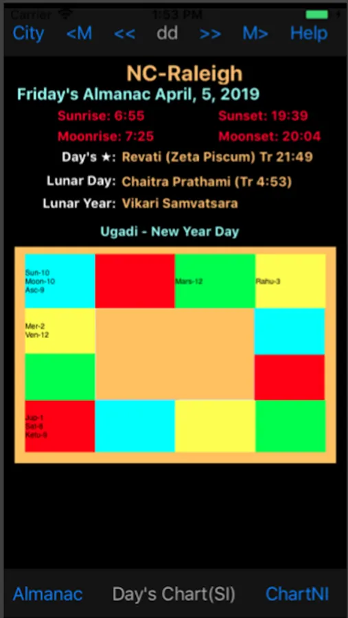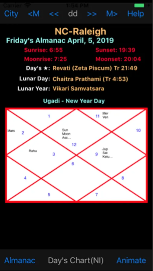 This provides current calendar date with Sunrise, Sunset, day’s star with its transition time, lunar month, tithi and year followed by any major festival events for the given city of choice. Users can navigate through days and months for the current year that gives corresponding Vedic almanac details as well as charts for planetary positions. Charts can be displayed under South or North Indian formats. One can quickly switch between these chart formats using the tool bar button as shown in the screen shots.