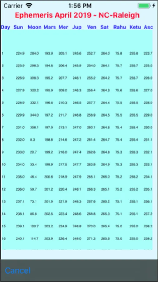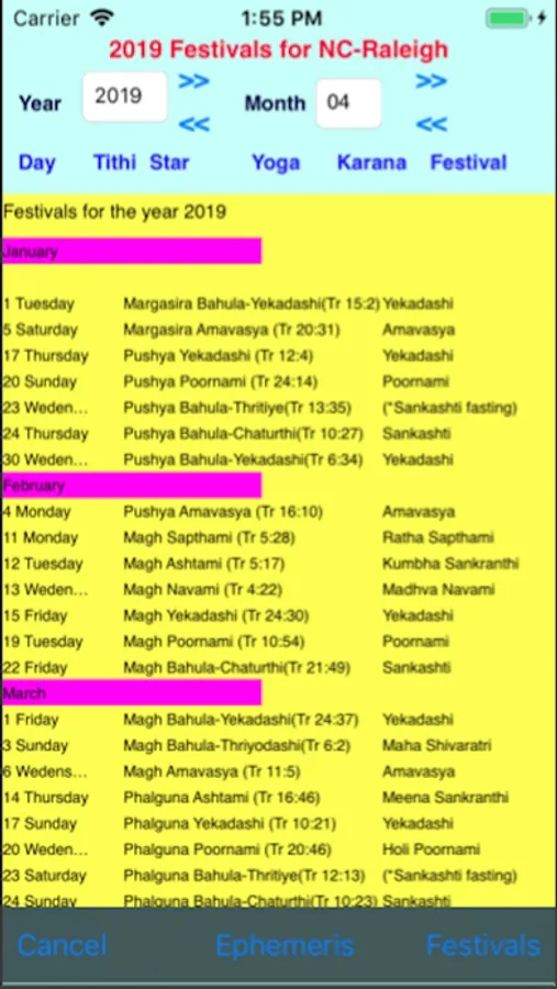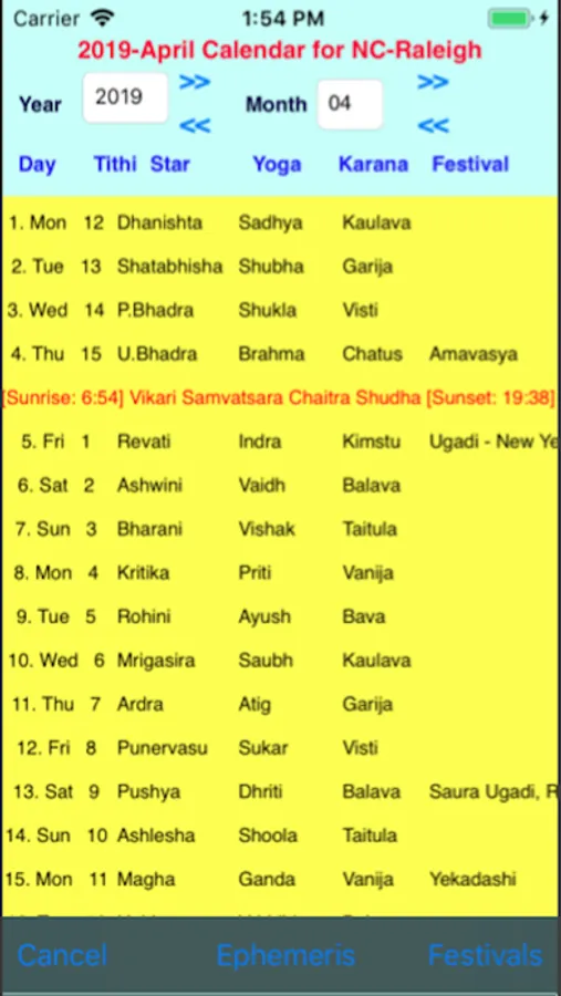 This section gives the almanac details for any given month that enables the user to quickly glance through the list of important festivals, days for rituals etc. This Vedic calendar is further supplemented with ephemeris data and table is provided in a separate section. This enables users to cast their own charts for any specific day and time of the month in the given year. In addition users also can generate a comprehensive list of festivals and important lunar days for the given year and city that helps users to plan respective Vedic ritual ahead of time.