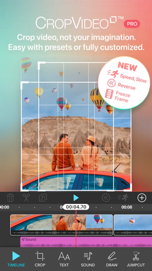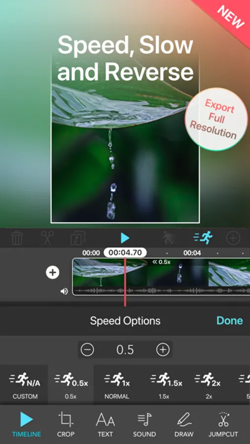 Make your videos fun and amazing with adding speed or slow motion, reverse, freeze frames.
