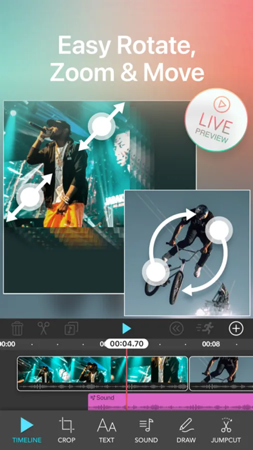 CropVideoSquare™ gives you incredibly quick and easy ways to pinch, zoom, drag and crop! anywhere
