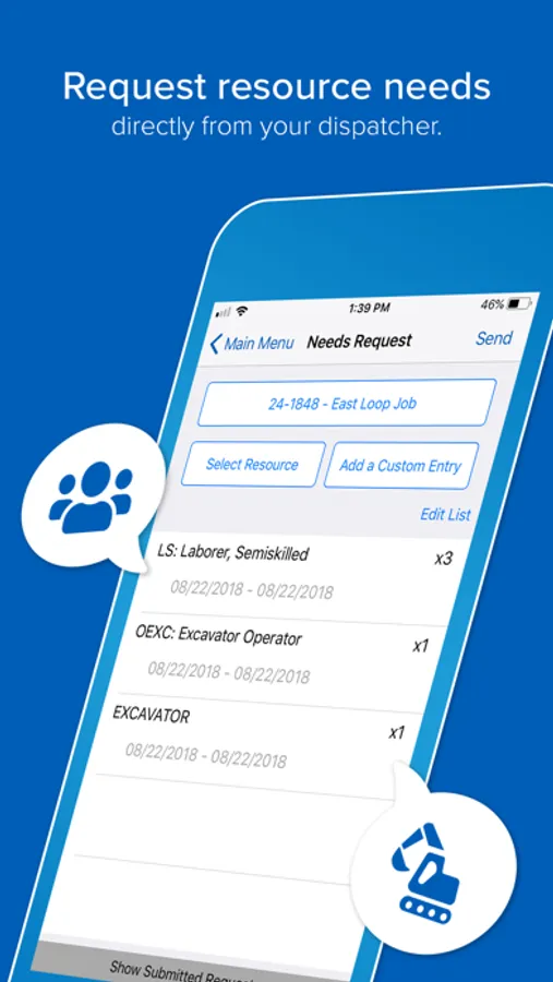 • NEEDS: Need more resources to meet production goals? Send requests directly to your dispatcher (requires HCSS Dispatcher).