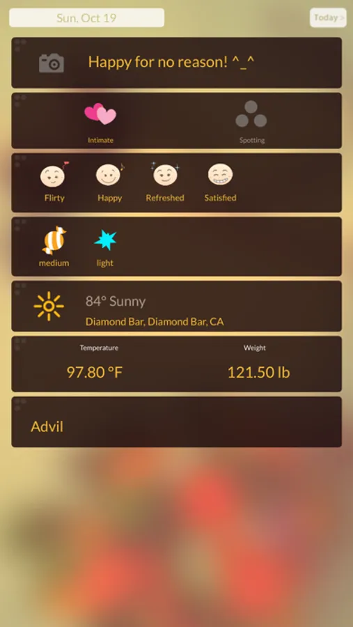 • easy way to track period, moods, health symptoms, weight, temperature, weather, notes, medications and pregnancy