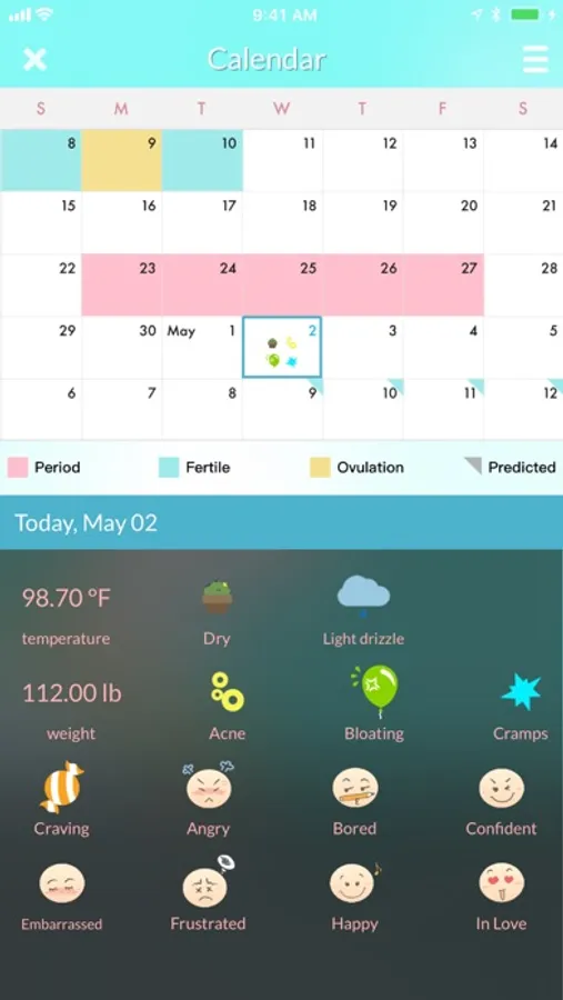 It's easy to see predicted periods and fertility days - essential for planning dates and vacations and avoiding unpleasant surprises!