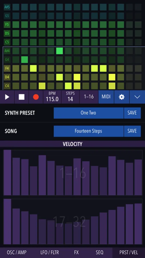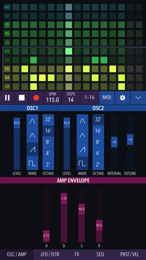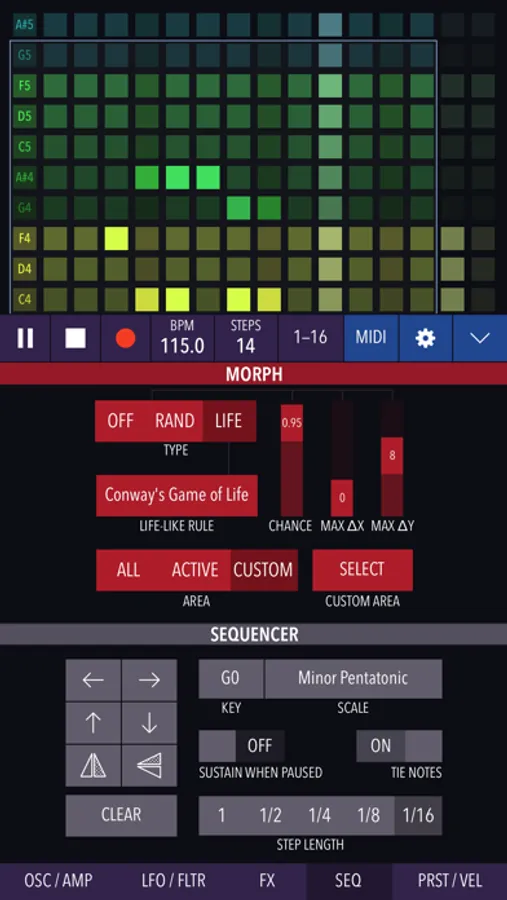 Create patterns and modify them in real time, or let Xynthesizr do it for you using its morphing algorithms. Change scale and key, or transpose within a scale on-the-fly. Tweak parameters of the internal synthesizer or output MIDI to your favorite apps and devices. Record and share your creations.