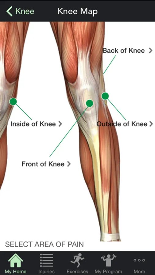 The injury identifier feature found within the app allows users to filter through a variety of descriptions that could possibly identify the knee injury that you are suffering from. When selecting the area of pain the user is prompted with a detailed description of specific symptoms that would be associated with a particular injury. The user is prompted to select the symptoms that best describes what they are feeling.