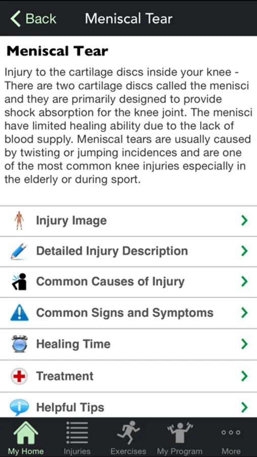 Each and every knee injury found within the app has a vast amount of vital information that aims to educate and inform users of their specific knee injury they are suffering from. For each injury you will find: