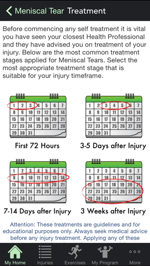 For each and every knee injury found within the app you will find specific treatment guidelines for specific stages of your injury treatment. These treatment stages are broken down into first 72 hours after injury, 3-5 days after injury, 7-14 days after injury and 3 weeks + after injury. For each of these stages you will find specific strengthening and flexibility exercises commonly used to treat specific injuries.