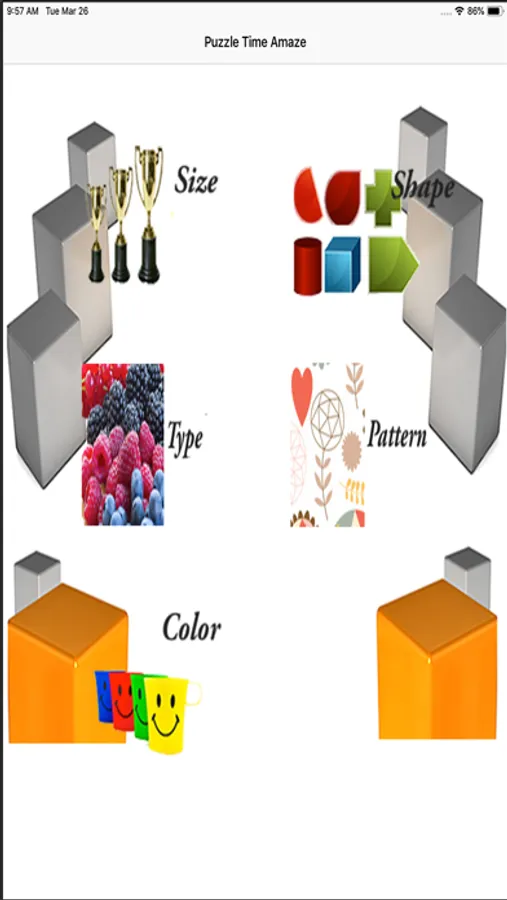 "Kidz Puzzle Time" as the name suggests, is composed of puzzles categorized in to 5 sections. This app is designed to improve learning by solving puzzles on size, shape, type , pattern and color. This application has relevant and quality images to understand the problem and think about the possible solution. Scores at the end of each section enables one to keep track of their progress. Each category has 15 - 16 questions.