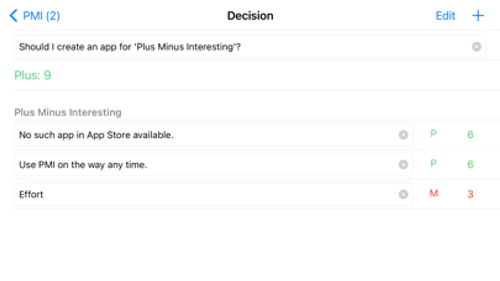 'Plus Minus Interesting' is a decision making tool for the technic described by Edward de Bono.