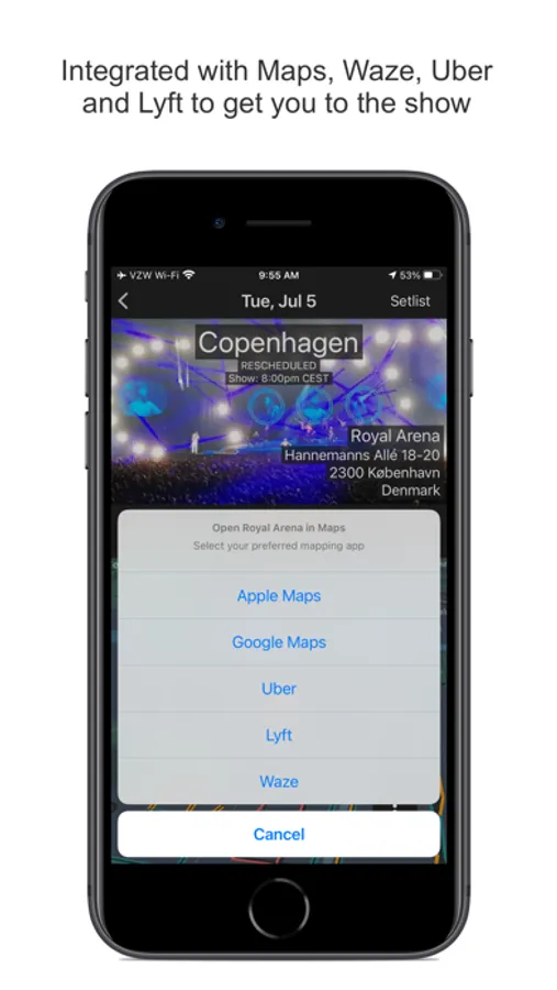 > Integrated with Maps, Uber, Lyft and Waze for additional ways to help you get to each venue