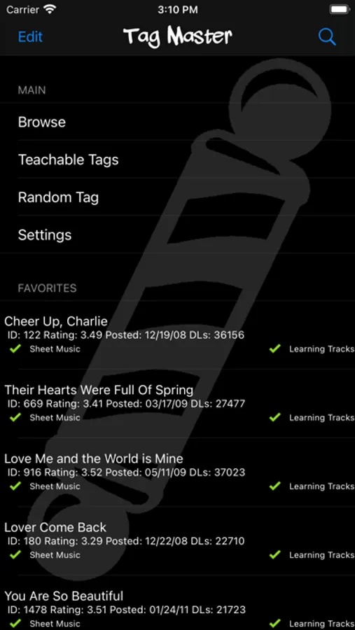 - Open up a random tag, view sheet music (when available), and listen to learning tracks (when available)