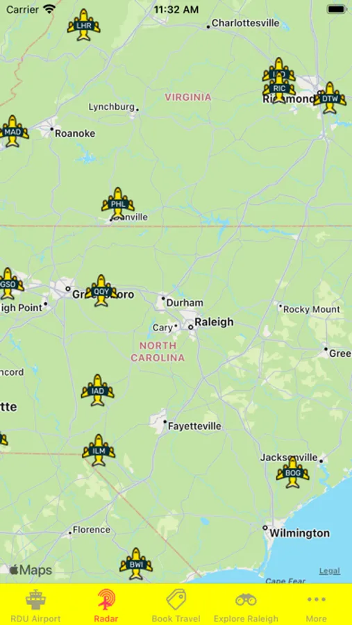 Raleigh Durham International Airport (RDU) serves the state capital region and the Research Triangle of North Carolina. The airport is located about 18 miles northeast of downtown Raleigh.