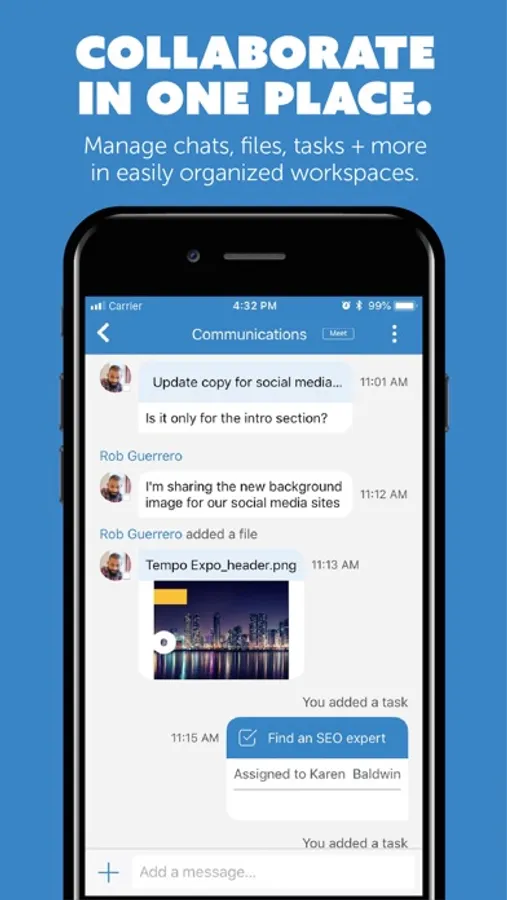 Of course, you can chat but there’s so much more. Say goodbye to endless switching between apps and hello to a simpler way to work. Team-One’s persistent workspace model puts everything your teams need for better collaboration in one place.